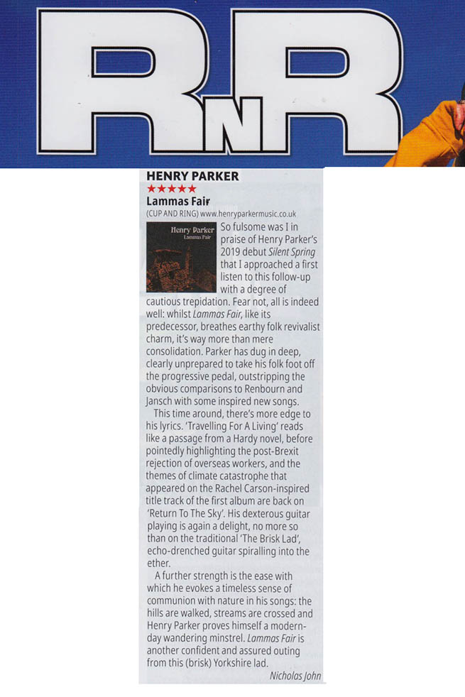 “Channelling the ghosts of Jansch and Renbourn through his fingertips, the fluid playing and emotive singing of Yorkshire-born Henry Parker evokes the spirit of the early-60’s folk revival as if it were yesterday.” RnR Magazine ★★★★★